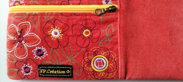 velours rouge délavé vintage - brodé - avec mousse sur résille épaisse de 5 mm
